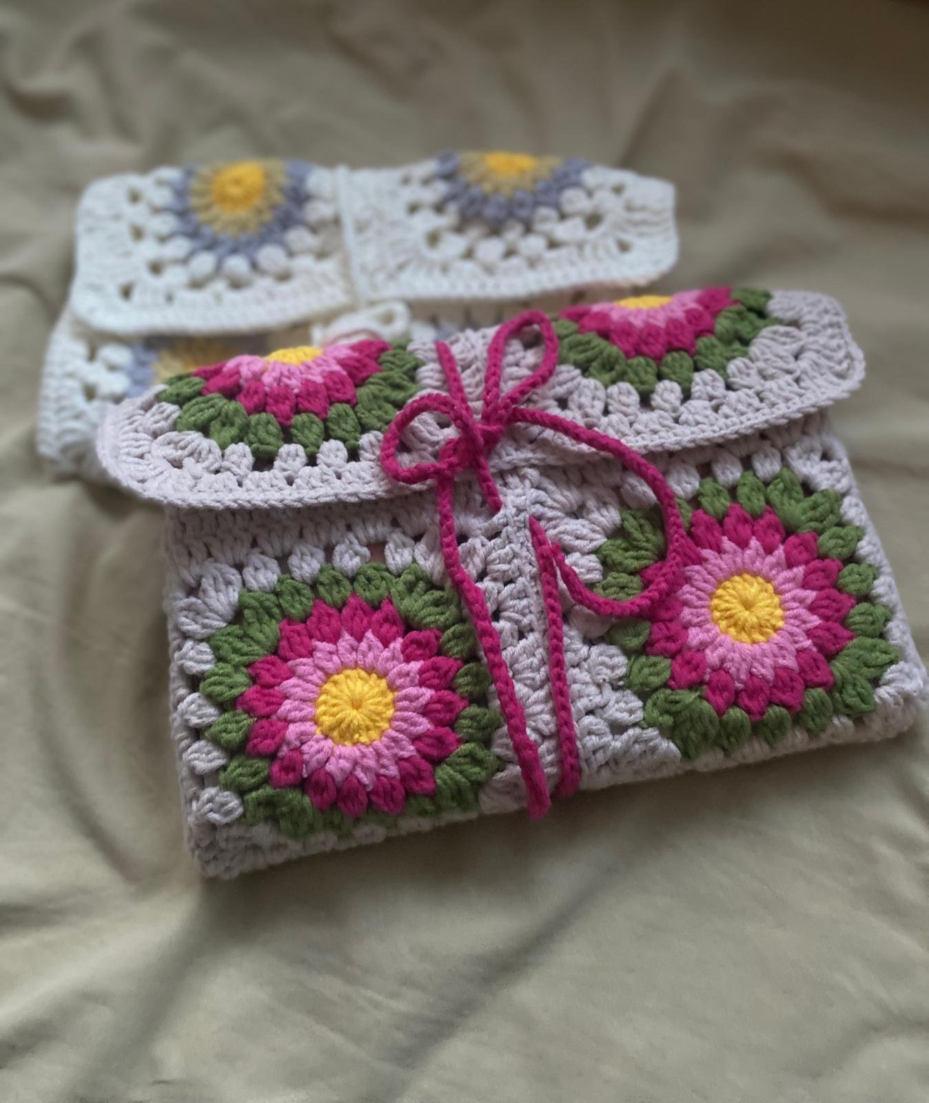 Deze handgemaakte boekenhoes is gehaakt van stevig katoengaren en versierd met een kleurrijk bloemmotief. De hoes beschermt je boek of notitieboek tijdens het meenemen en geeft het tegelijk een persoonlijke, ambachtelijke uitstraling. De sluiting met koord houdt de inhoud netjes op zijn plaats.